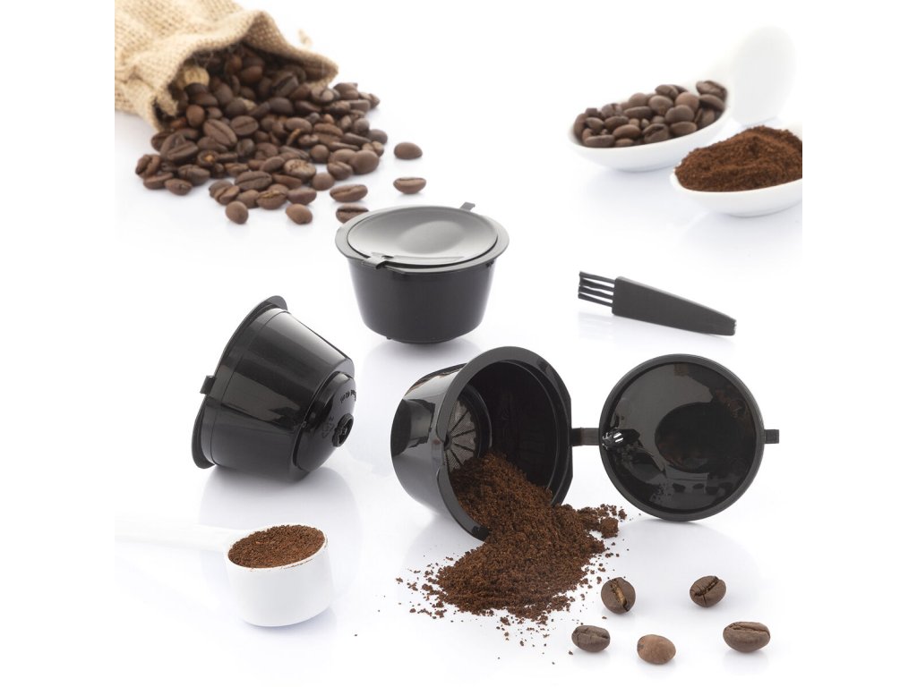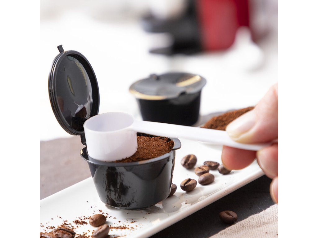Ez az újratölthető kávékapszula készlet tartalmaz egy kiskanalat, amellyel az őrölt kávét a kapszulába helyezi, és a kívánt intenzitásnak megfelelően nyomja meg, majd csak le kell zárni a kapszulát és be kell helyezni a Dolce Gusto kompatibiliskávéfőzőbe. Minden kapszulát legfeljebb 50 alkalommal lehet újra tölteni.