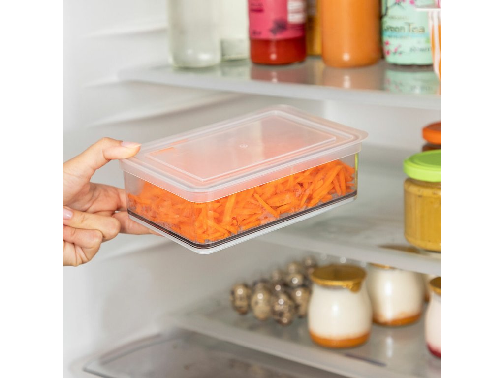 • Tartály fedéllel: komplett 5 az 1-ben mandolinunk tartalmaz egy csúszásmentes alappal és áttetsző fedéllel ellátott tartályt. Ez a praktikus tartály összegyűjti a levágott zöldségeket, amíg a mandolin használatban van. Fedelével együtt nagyon hasznos a lerakott zöldségek és egyéb élelmiszerek tárolására is.