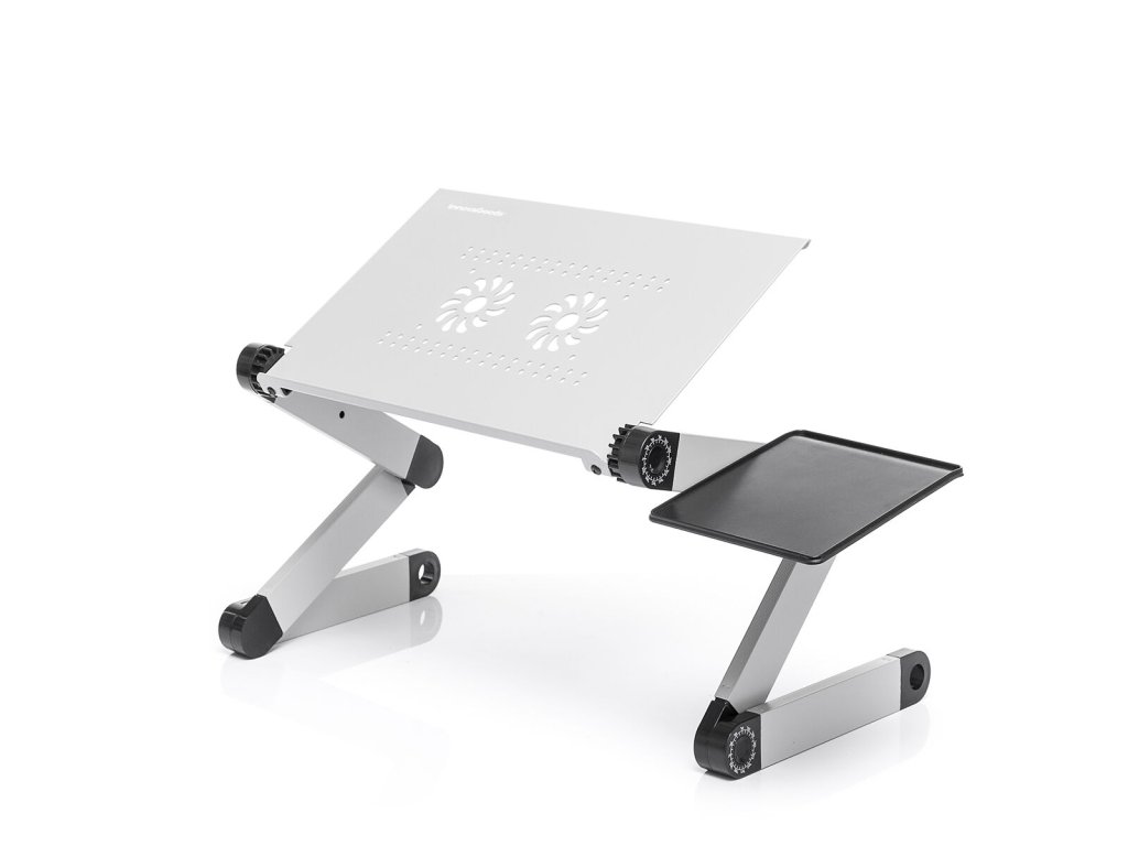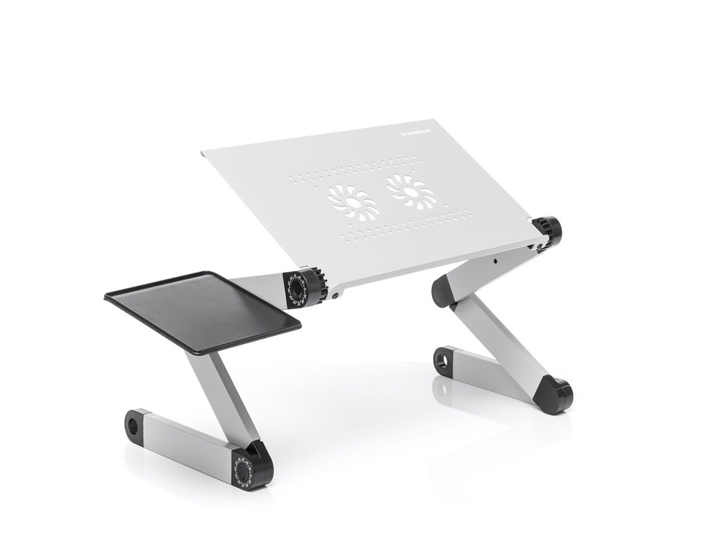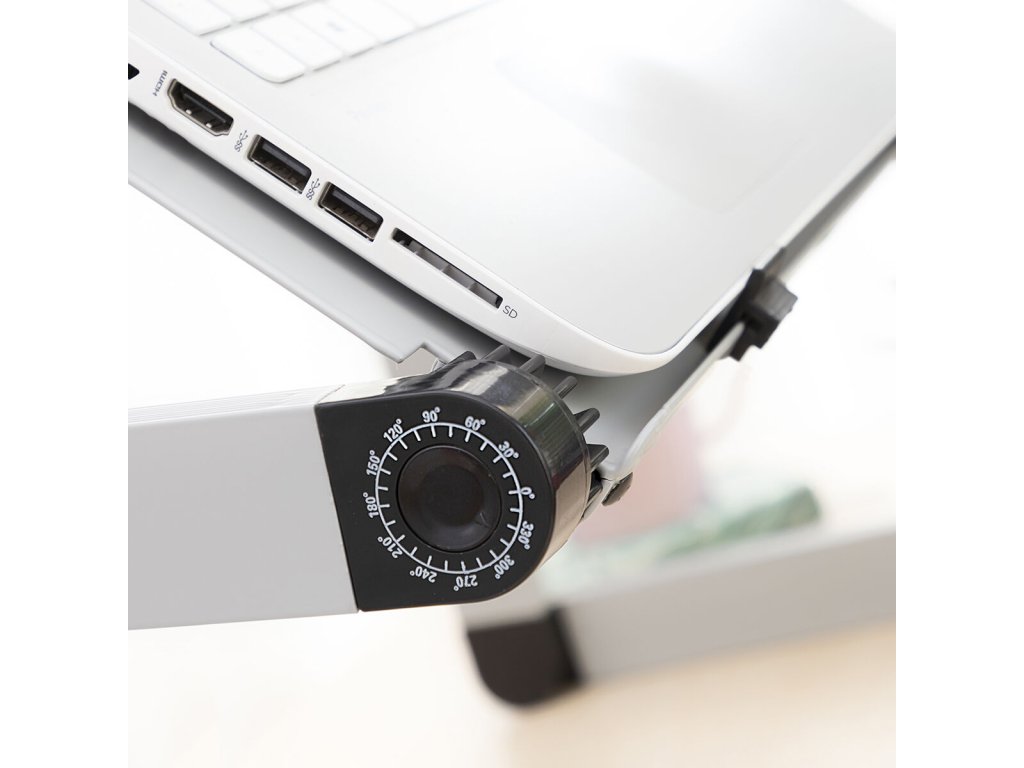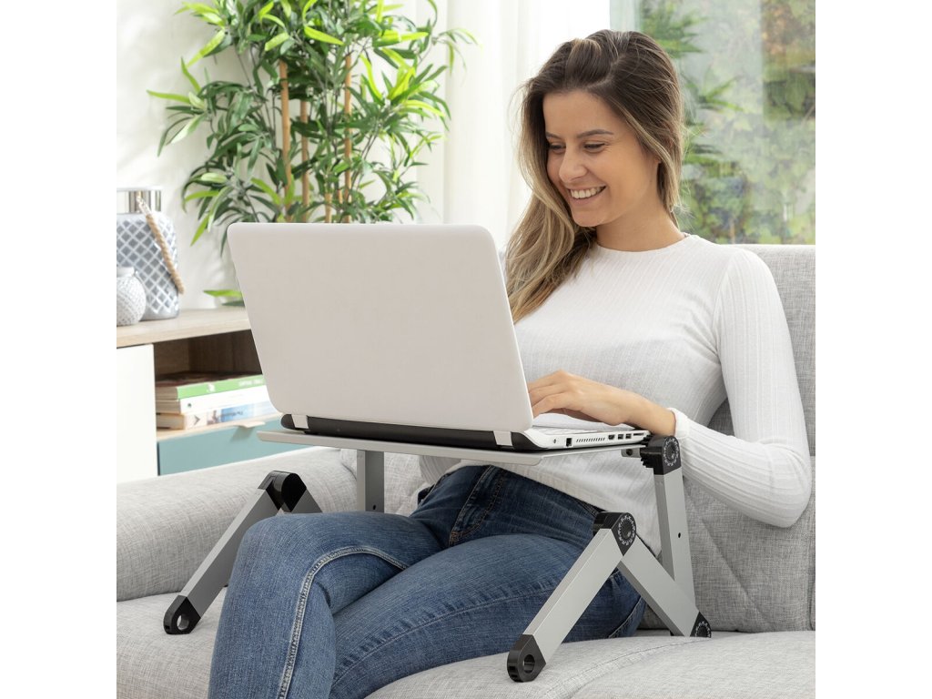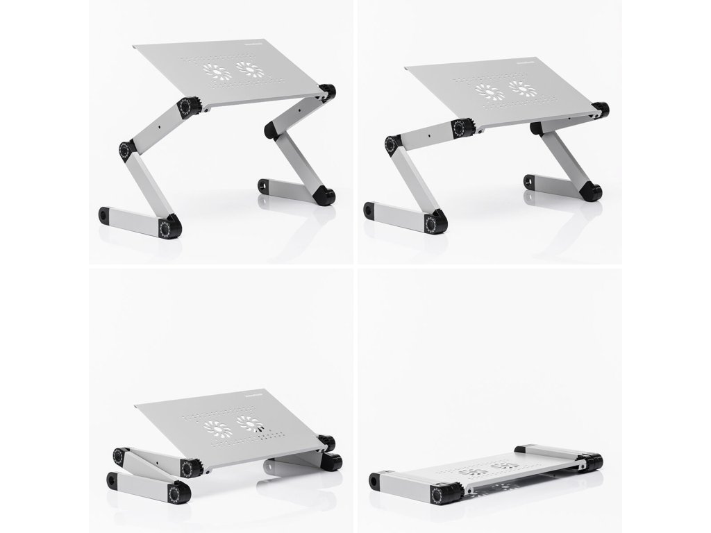 Állítható többcélú asztal, ideális laptop használatához. Nagyon hasznos étkezés közben, zenei állványként stb.Sokoldalúságnak és az adaptálható összecsukható kialakításnak köszönhetően különböző pozíciókban használható: széken vagy a padlón, fekve vagy ülve, felállva stabil felület, stb. Külön tálca van az egér számára, és két lába 3 pontban van összekötve, 360 ° -os elforgatással, amely lehetővé teszi a magasság és a szélesség beállítását, így ha végtelen sok lehetőséget kínál a teljes alkalmazkodásra bármikor az Ön igényeinek megfelelően. A perforált alumínium tartóalap javítja a szellőzést és csökkenti a túlmelegedést.