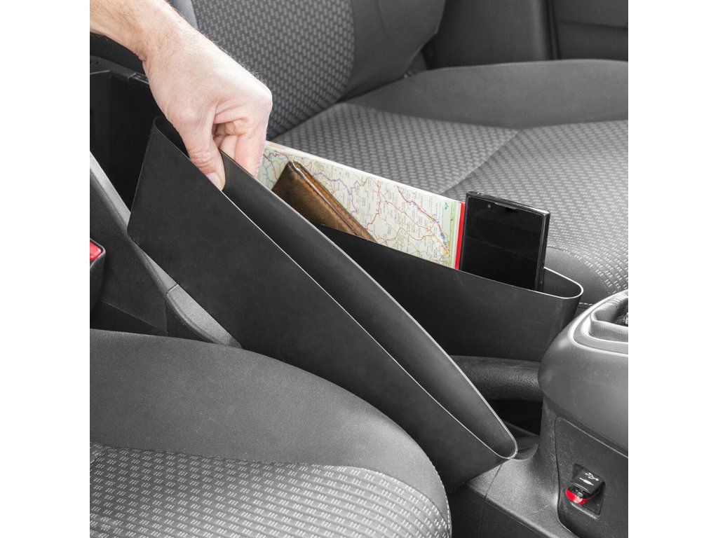 Egy kényelmesen használható és praktikus találmány, amellyel mindig egy helyen és kéznél tarthatod autódban a hasznos holmikat: térképet, jegyzetfüzetet, tollat, kulcsot, mobilt, töltőt stb. Modern és funkcionális kivitelezésének köszönhetően könnyen elfér az autó elülső ülései között.