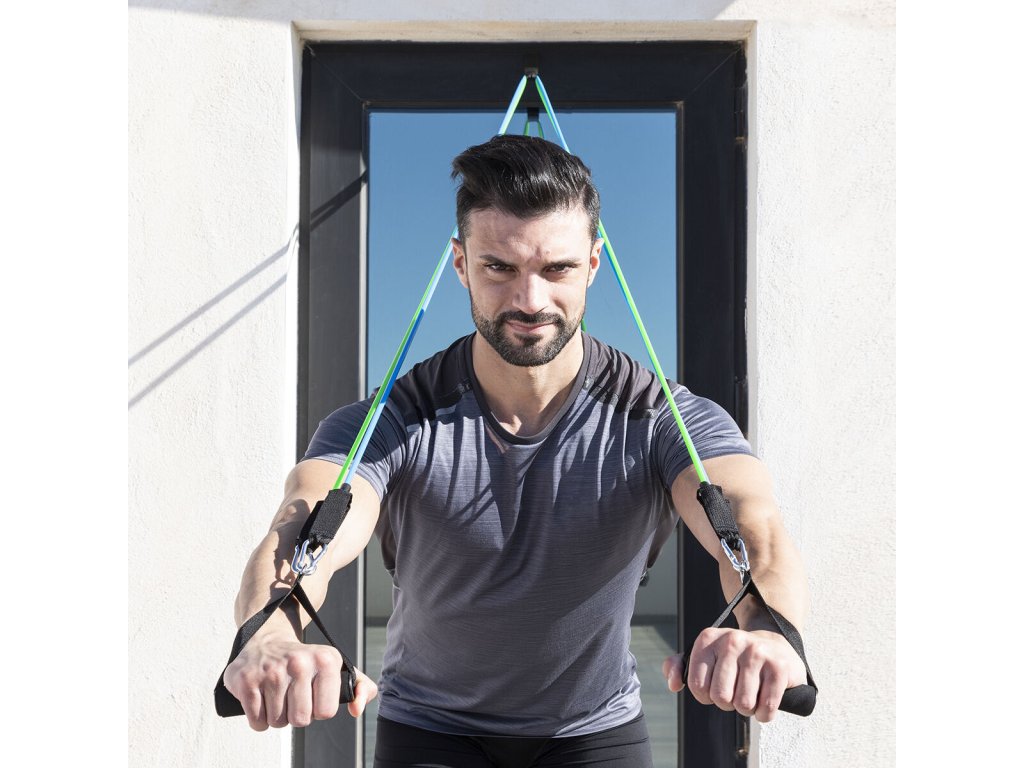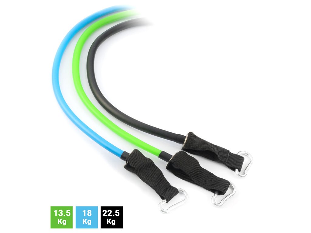 3 állítható, különböző színű ellenállási szalag (az intenzitás szintjétől függően), gyakorlási útmutatót, egy hordtáskát és kiegészítőket a karok, vállak, mellkas, fenék, lábak stb. tartalmaz. A rugalmas szalagok együtt vagy külön is használhatók, habfogantyúval és fém karabinerrel rendelkeznek az optimális tapadás és tartás érdekében. Hordozható kialakításának és hordtáskájának köszönhetően bárhol könnyen használható.