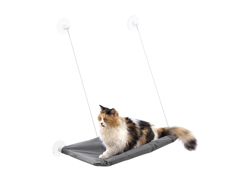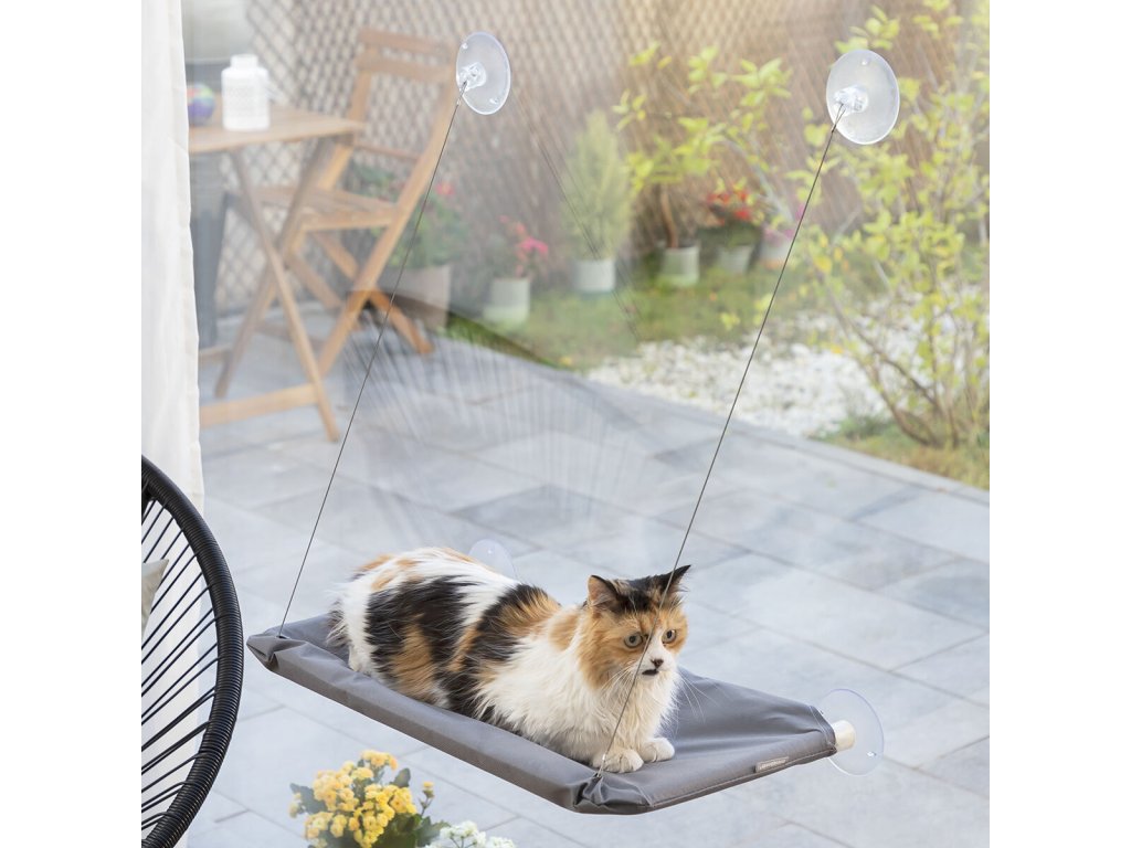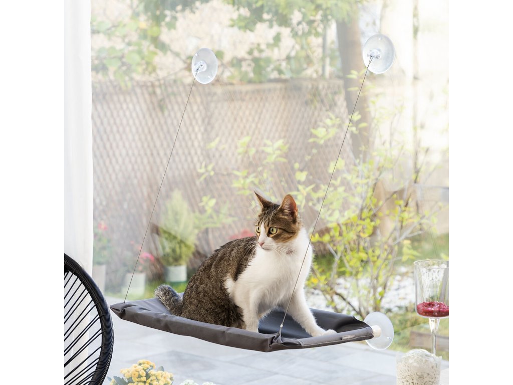 Modern és elegáns függőfüggőágy macskáknak. Tökéletes házi kedvencek számára, így kényelmesen élvezhetik saját terüket...egy olyan helyet, ahol a világgal való törődés nélkül nézhetik a tájat, napozhatnak, játszhatnak, ugrálhatnak stb. A macskák szeretik a magasságot, ezért lenyűgözi őket ez a felakasztott függőágy, amely bármilyen magasságban elhelyezhető, hatékonyan kihasználva a teret, miközben rendet is megtartja. Könnyen felszerelhető 4 erős tapadókoronggal, amelyek szilárd tartást biztosítanak (nincs szükség szerszámra), és akár 30 kg súlyt is elbírnak. A függőágyat elsősorban ablakokra vagy üvegajtókra szerelik (beltéren, tiszta és sima, nem porózus felületekre). Ez az eredeti macskafüggőágy nagyon sokoldalú és alkalmazkodó a többpozíciós kialakításának köszönhetően, amely könnyű és hordozható, így bármikor mozgathatja. Több műanyag csőből és két függő fémkábelből áll, amelyek biztonságosan elbírják a súlyt, megakadályozva, hogy a macska megrágja és eltörje őket. Az Oxford szövet tartóhuzat ellenálló, légáteresztő és kézzel mosható. Könnyen össze- és szétszerelhető a mellékelt utasításokat követve, és nagyon kevés helyet foglal el tárolás közben.