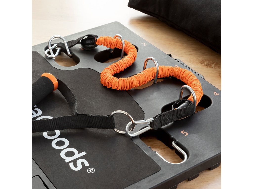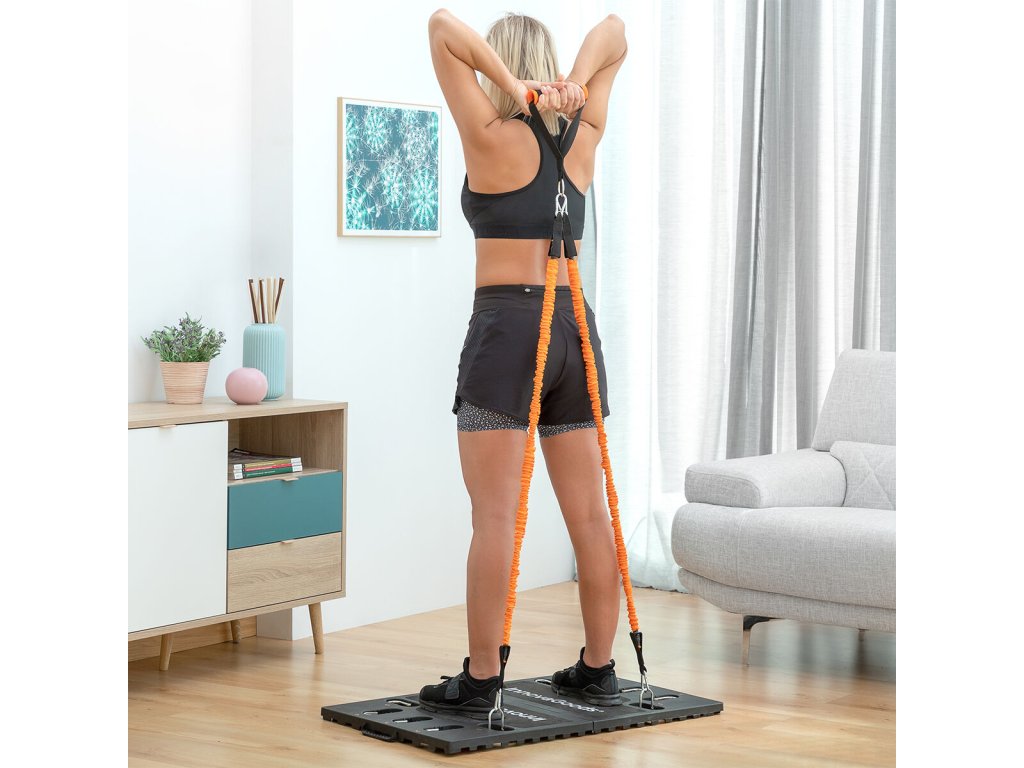 Átfogó,komplex edzőkészülék, amely számos gyakorlást tesz lehetővé különféle kiegészítőkkel. Ideális az egész test (törzs, karok, lábak és hát)edzésére. A kompakt és hordozható kialakításnak köszönhetően, könnyen szállítható és tárolható, mivel középen kettéhajtható, így autóba, a szekrénybe vagy ágy alá tehető. Ezen kívül tartalmaz egy erős táskát is, amellyel kényelmesen hordozhatja az összes tartozékot. A gyakorlati útmutató nagy segítséget nyújt a legjobb eredmények eléréséhez.