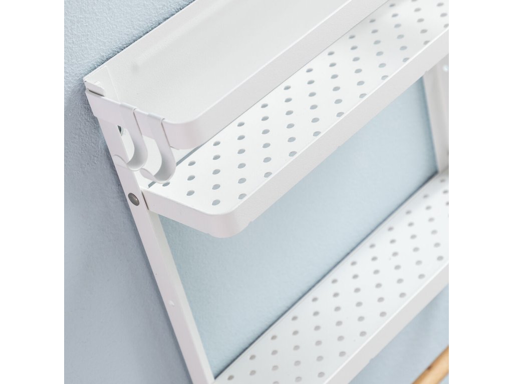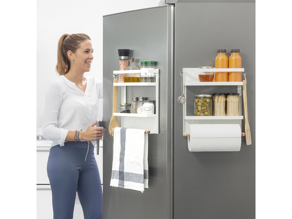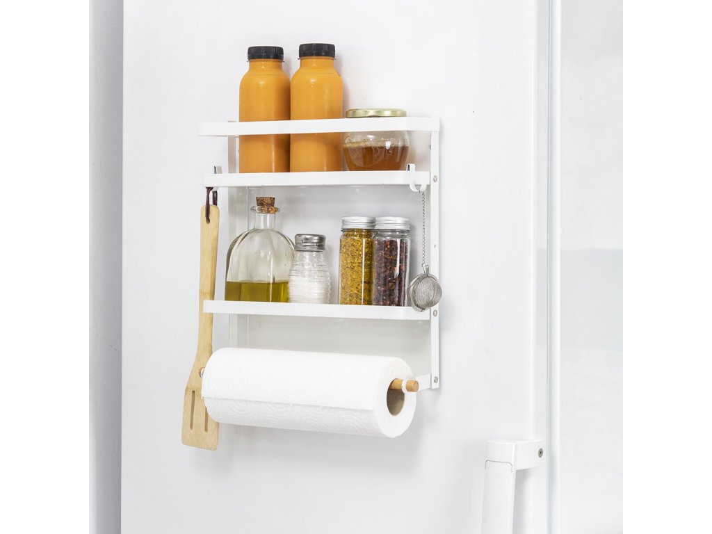 Sokoldalú és ellenálló többcélú mágneses szervező polc, amely nagyon hasznos a terek kihasználásához, és igy kéznél van mindenféle tárgy a konyhában, a fürdőszobában stb., mint például dobozok, kannák, papírtekercsek, kendők, törölközők, konyhai eszközök, tisztítószerek stb. Két könnyen összecsukható polccal rendelkezik, egy biztonsági rúddal, amely megakadályozza egyes tárgyak leesését, két mobil függesztőhoroggal és egy fából készült rúddal tekercsekhez, kendőkhöz stb. Helytakarékos és fenntartja a rendet, legfeljebb 5 kg súlyt támogat, és ideális hűtőszekrénybe, a mosógép vagy szárító oldalára, stb. Innovatív mágneses kialakításának köszönhetően a telepítése nagyon egyszerű, és nem igényel összeszerelést vagy szerszámokat, mivel könnyen tapad a fém felületekhez, bár 2 lyukkal rendelkezik a felakasztásához, ha úgy tetszik (2 csap és 2 csavar tartozik hozzá).