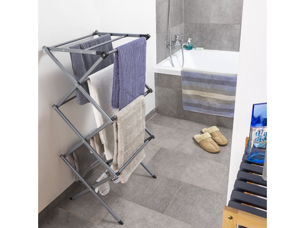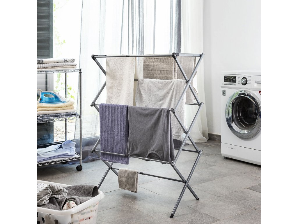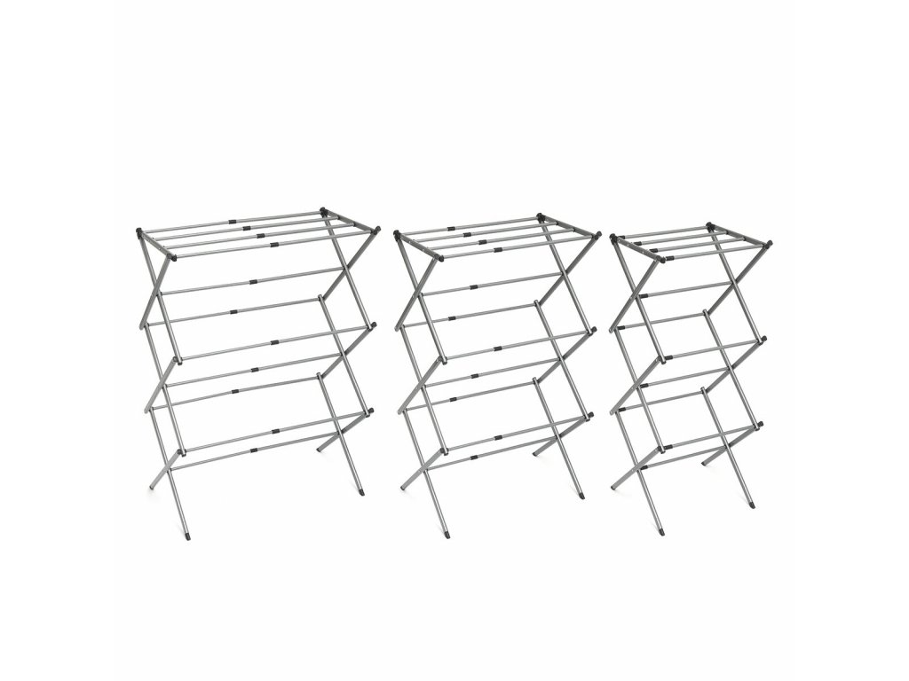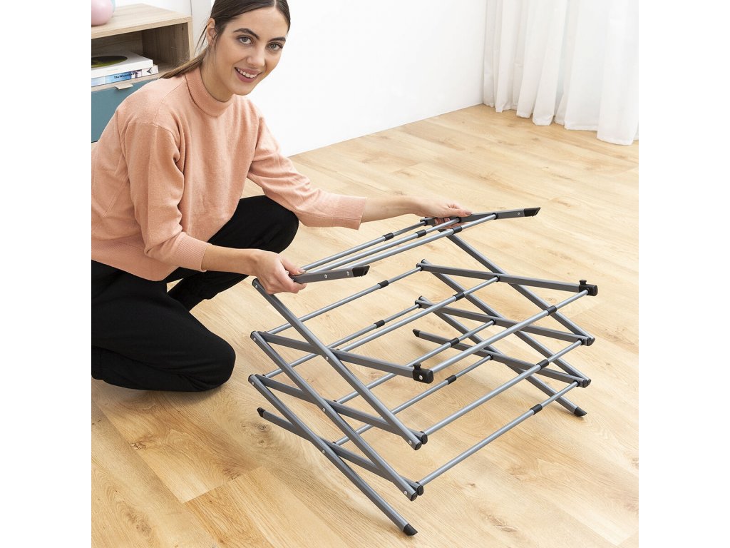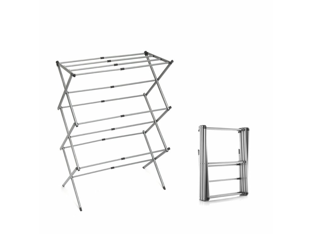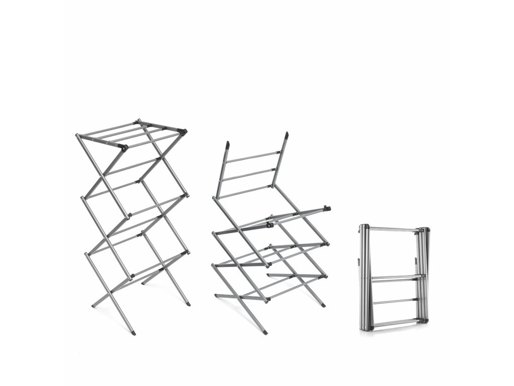 Összecsukható és kihúzható ruhaszárító 3 magasság szinttel. Ideális ruhák felakasztására és a hely optimalizálására használat és tárolás közben. Kialakítása lehetővé teszi, hogy a minden alkalommal felakasztandó ruhamennyiséghez igazodjon, nagyon kényelmes tárolni és minimális helyet foglal el. Ez az ötletes nagy kapacitású fém ruhaszárító 11 szárító rúddal rendelkezik, kompakt, könnyű és vízálló. Tartozék illusztrált kézikönyvvel a használatához, egyszerűen összeállítható szerszámok nélkül.