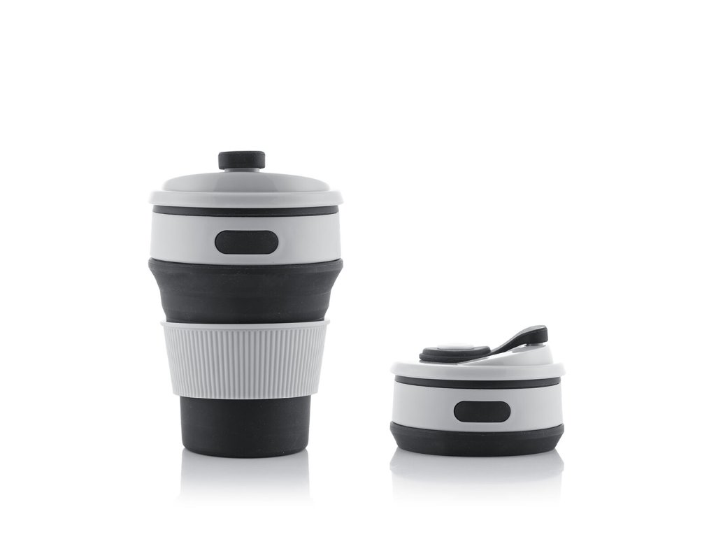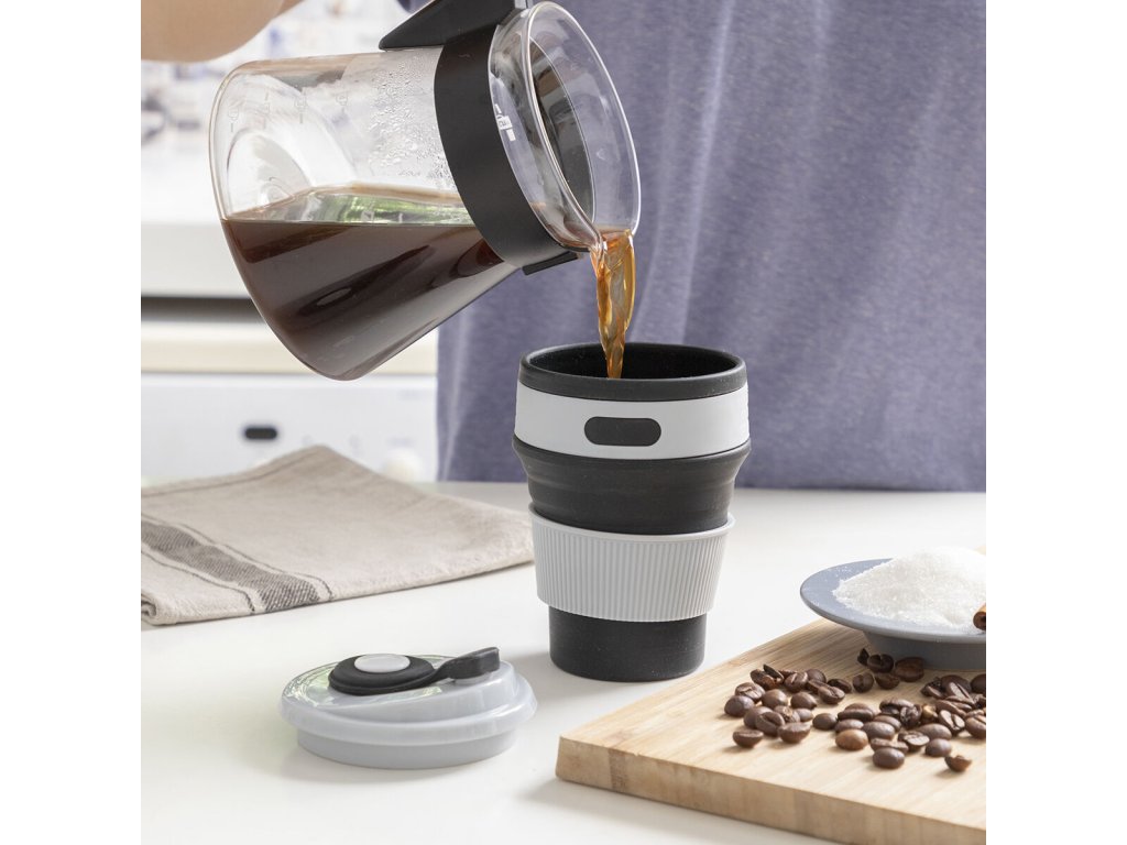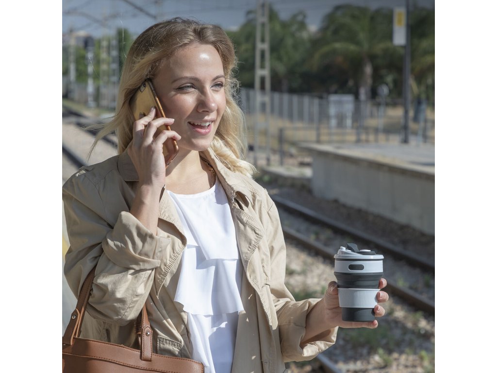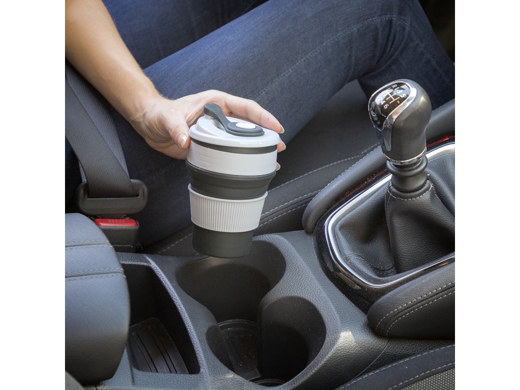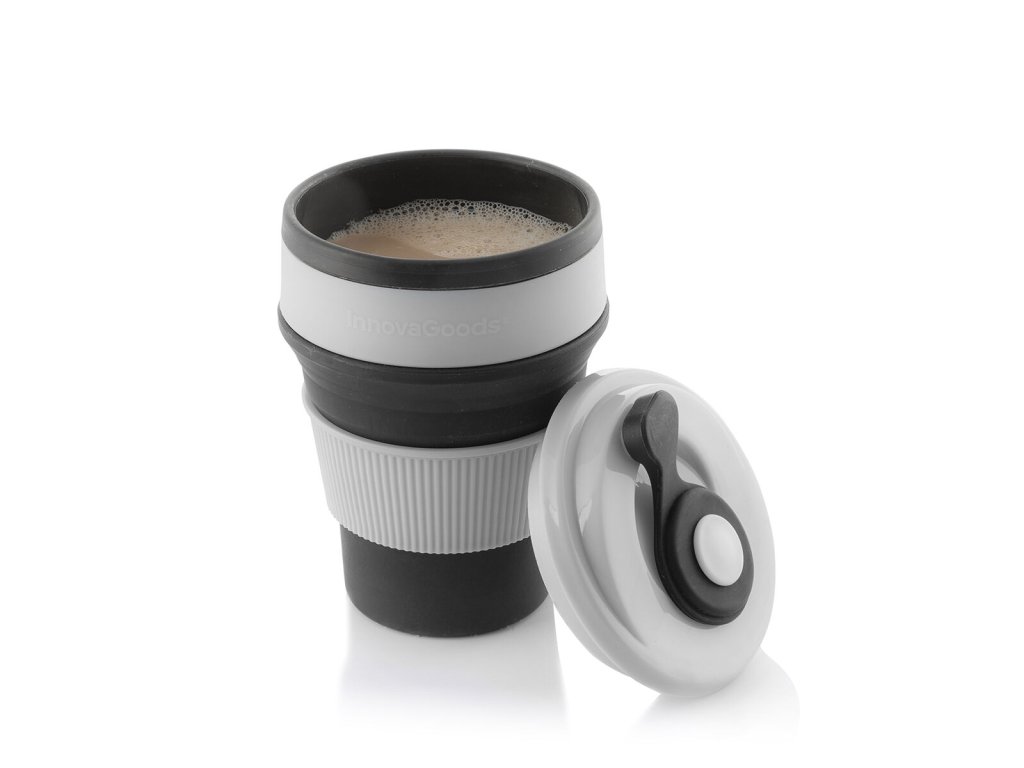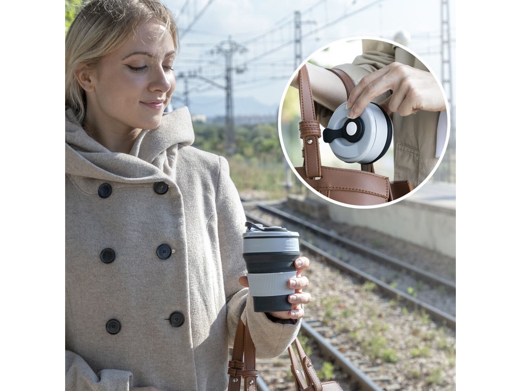 Nagyon kényelmes és könnyű összecsukható szilikon pohár, amely bárhová könnyen elvihető és minimális helyet foglal. Innovatív, többállású kialakításának köszönhetően ez a pohár igazán sokoldalú. 350 ml űrtartalmú, légmentesen zárható fedéllel és fedeles ivórésszel rendelkezik, ezáltal elkerülhető a kiömlés vagy a csöpögés. Égésgátló és csúszásgátló védelemmel rendelkezik, amely szintén jobb tapadást biztosít. Hideg vagy forró italokhoz, valamint mikrohullámú sütőben is használható. Könnyen tisztítható, mivel mosogatógépben is mosható. Újrafelhasználható, emellett pénzt takarít meg, és elkerüli az eldobható és szennyező csészék használatát. Tartalmazza a diagramokkal való használati utasítást, bár nagyon könnyen használható, hajtogatható és szétnyitható. Ideális irodákban, otthoni munkavégzéshez, autóban, utazáshoz stb.