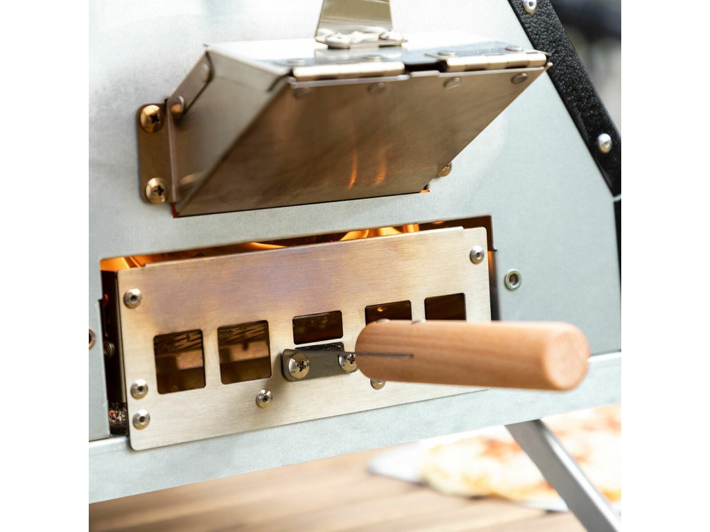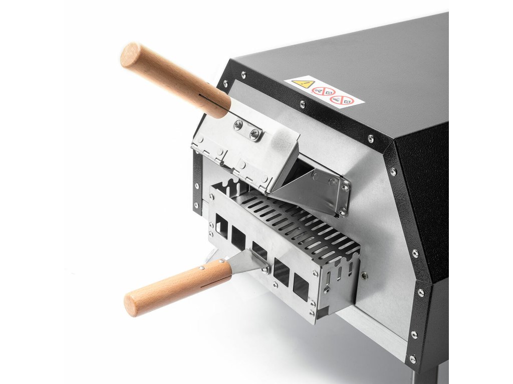• Kivehető ajtó, kerámia kő, pizzalap: ez a pellet pizzasütő tartalmaz egy követ, mint alapot, amelyre a pizza sütés közben ráhelyezhető. Az elülső ajtó fa fogantyúval és csúszó kukucskálóval rendelkezik a tűz ellenőrzéséhez a sütő kinyitása nélkül, és kivehető a pizza könnyű be- és kirakodásához a fa fogantyúval ellátott fémlapát segítségével. Pizza (Ø): 30 cm max.
