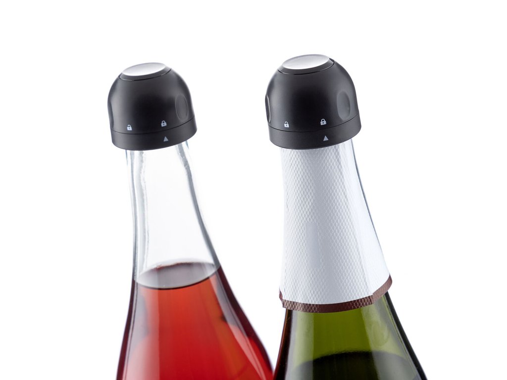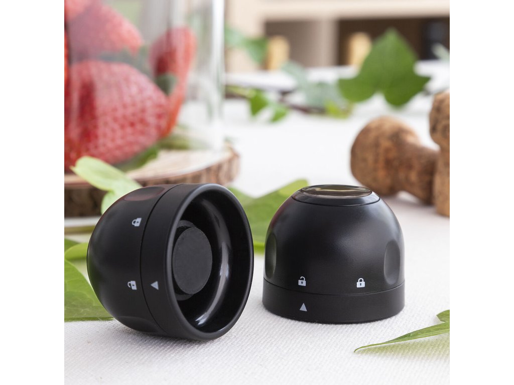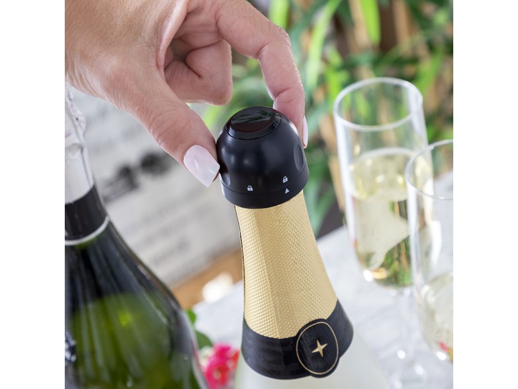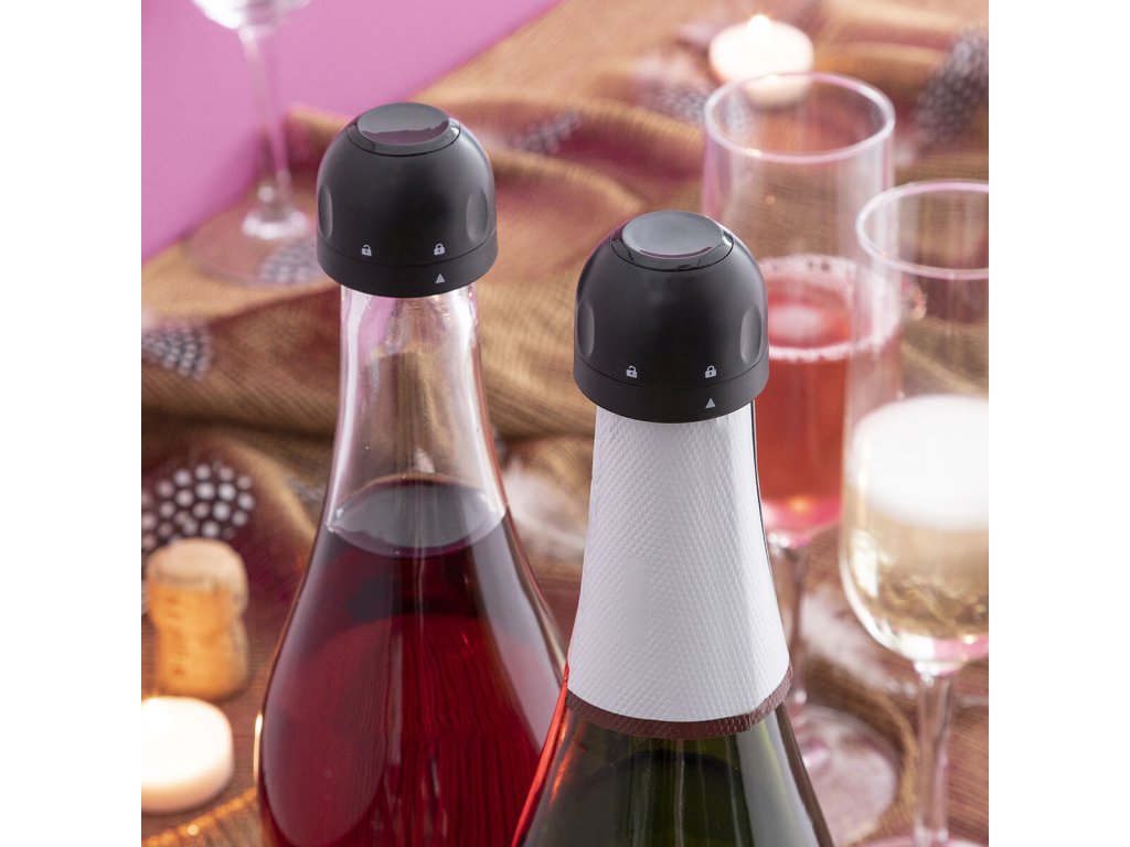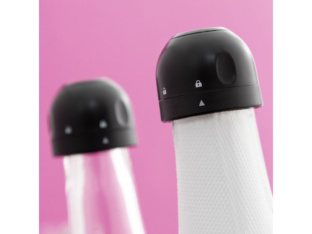 2 db modern és elegáns kialakítású pezsgősüveg palackdugó, amely lehetővé teszi a palackok hermetikus lezárását. Könnyű tömítőrendszere megakadályozza, hogy az ital elveszítse a szénsavtartalmát, hosszabb ideig megőrizve a palackban lévő ital jellegét, mintha éppenakkor nyitották volna ki. Nagyon könnyű működtetni. Először fordítsa el, amíg a nyíl nem találkozik a nyitott lakat szimbólummal, majd helyezze be a dugót teljesen a palack nyakába. A tömítőzár aktiválásához egyszerűen fordítsa el úgy, hogy a nyíl megfeleljen a zárt lakat szimbólumnak. A dugó eltávolításához fordítsa újra a nyitott lakat szimbólum felé. Ezt az eredeti dugót pezsgő italokhoz és pezsgőhöz, cava és prosecco típusú palacknyakakhoz (17,5-18 mm) tervezték. A tömítőzár nem működik borospalackokon vagy más, különböző nyakú palackokon, mint amilyenre tervezték, bár hagyományos légmentesen záródó dugóként is használható ezeken a többi palackon. Ergonomikus is, mivel különböző fogási területekkel rendelkezik, és alakja az ujjhegyekhez igazodik a kényelmesebb használat érdekében. Szilárd tartást biztosít, és megakadályozza a csöpögést és a kiömlést.