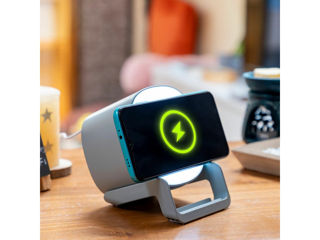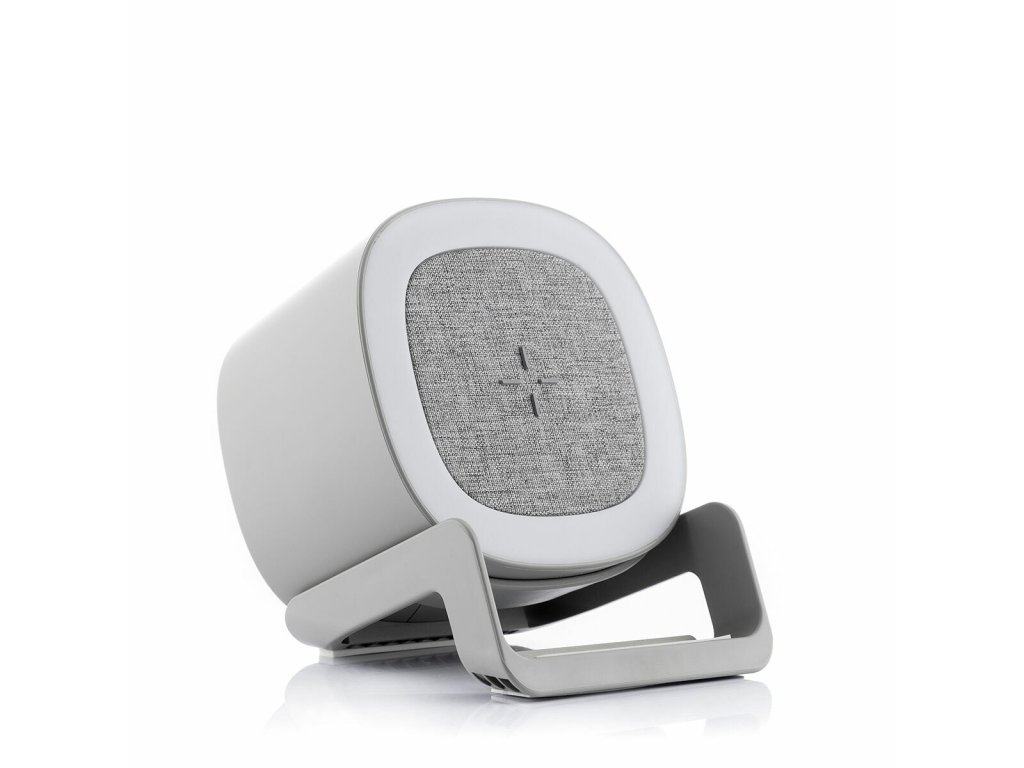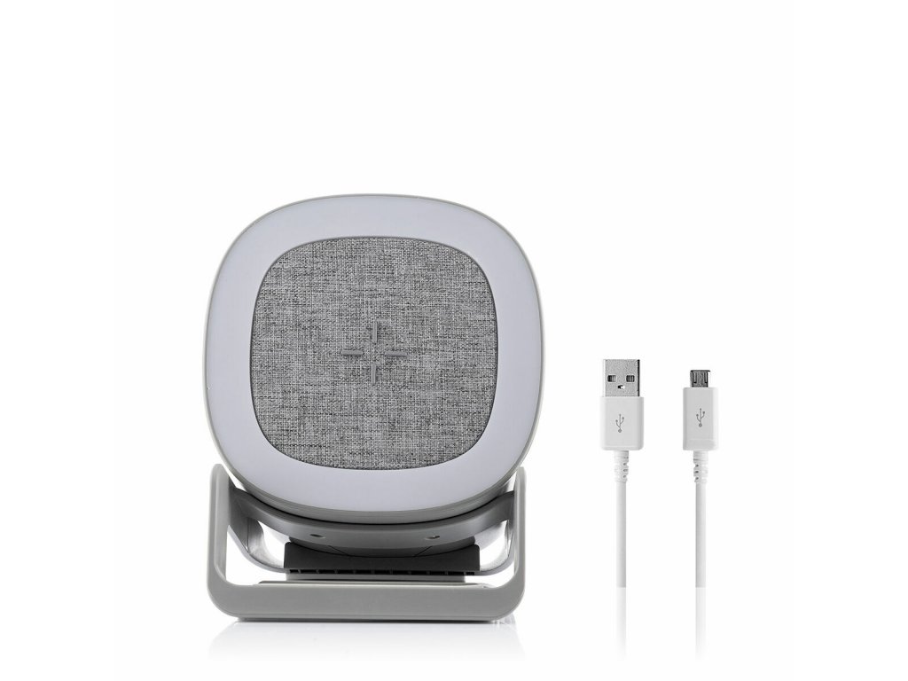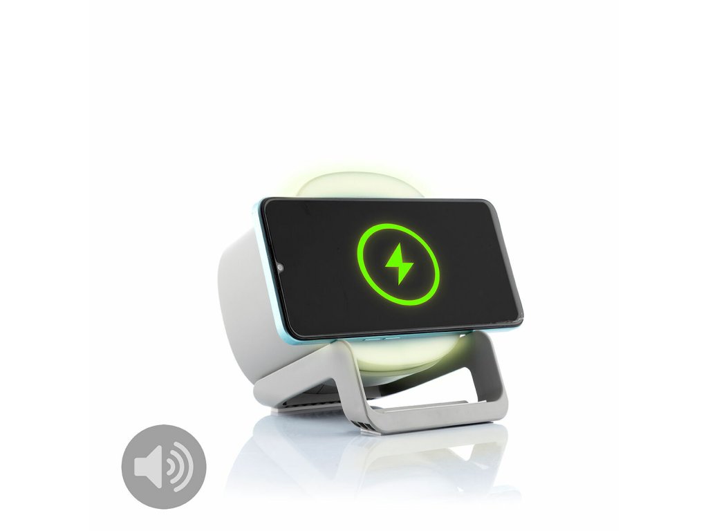 Ötletes vezeték nélküli töltő LED-del és hangszóróval, amely érintőkapcsolóval rendelkezik a LED-fény aktiválásához, és 2 támasztózónával rendelkezik a mobil vízszintes vagy függőleges helyzetbe helyezéséhez.